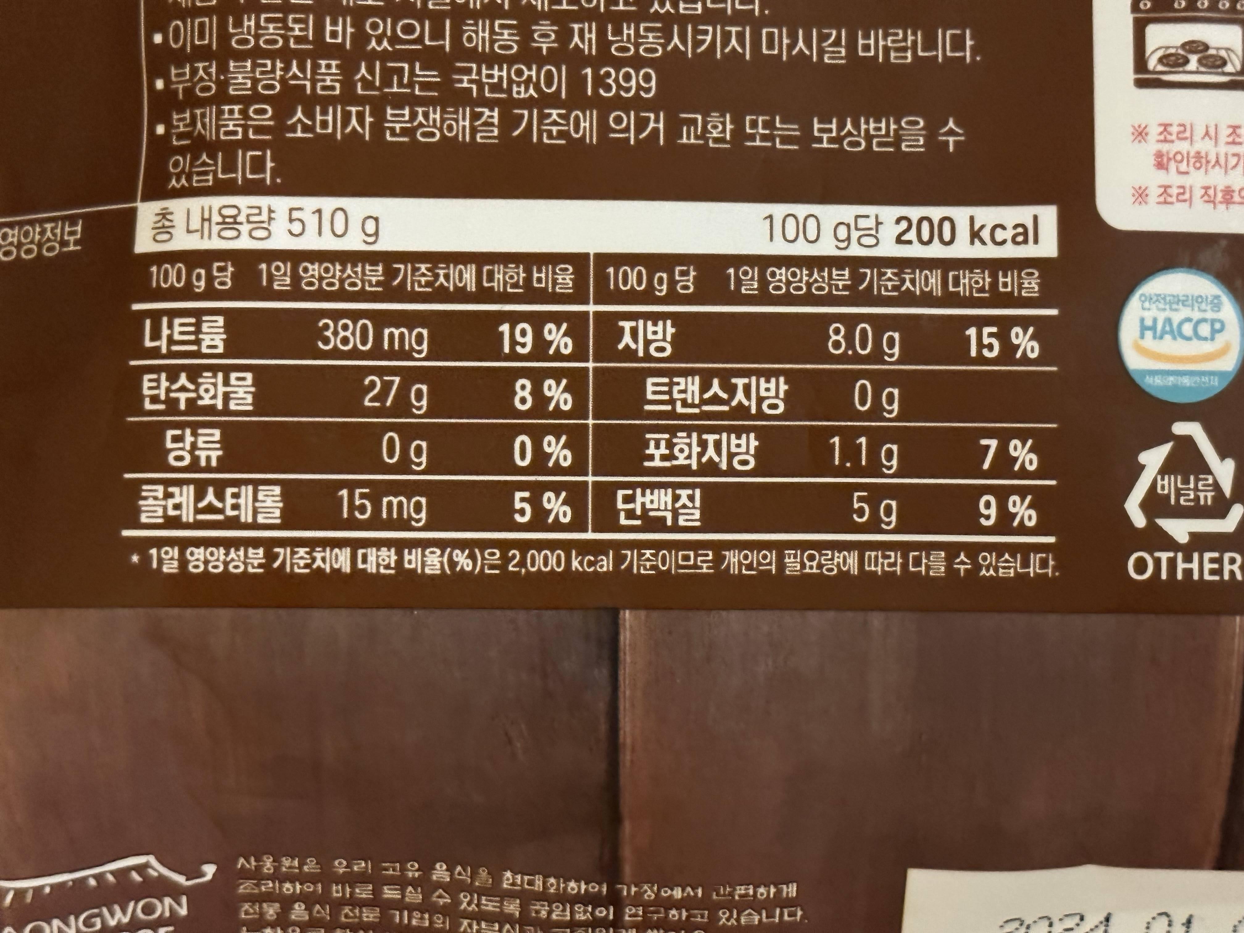 칼로리는 100g에 200kcal이고, 총내용량이 510g이니 총칼로리는 1020kcal입니다.