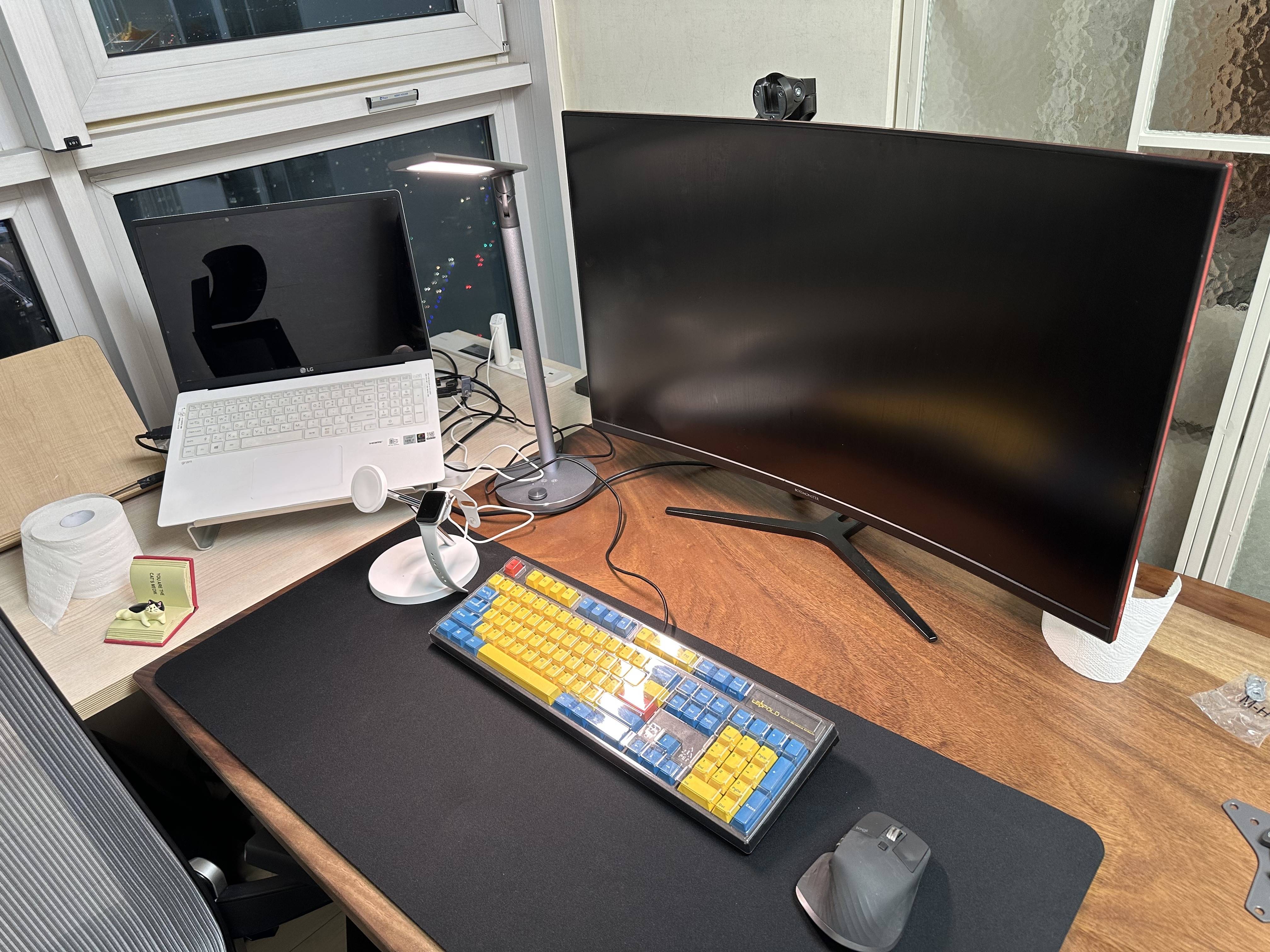 완성 사진입니다! 모니터 하부에 쓸 수 있는 공간이 생겼습니다! 그래서 독서대를 둬봤는데 독서대에 책을 두고 타이핑을 할 수도 있겠네요! 처음 사진과 비교하면 훨씬 깔끔해진 모습입니다ㅎㅎ
