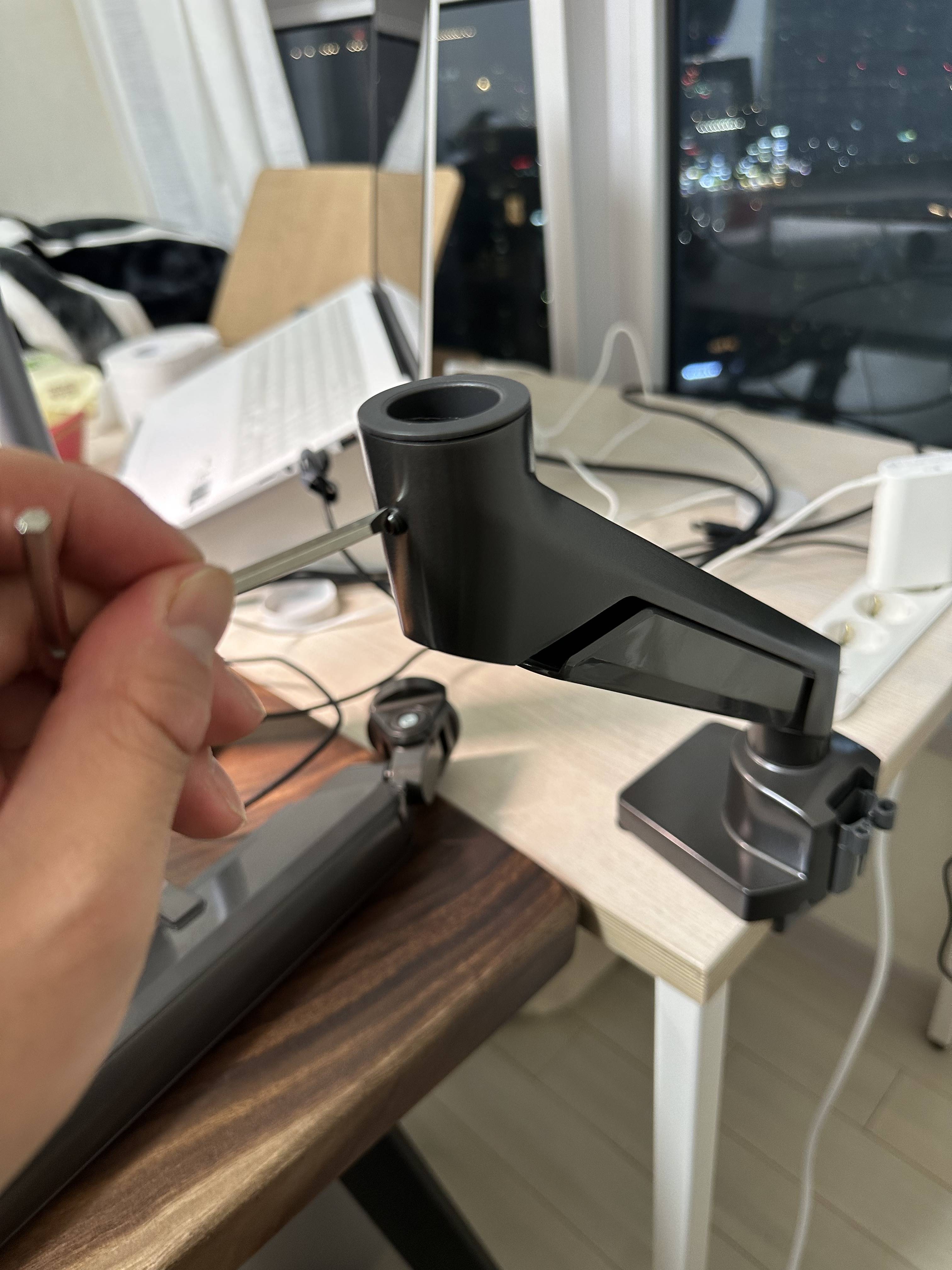 맨아래 부분을 육각렌치로 조이고 두 번째, 세 번째 암을 차례로 설치합니다! 마지막 사진은 흰색 책상에서 우드슬랩 책상으로 모니터암을 옮겨 설치한 사진입니다!!