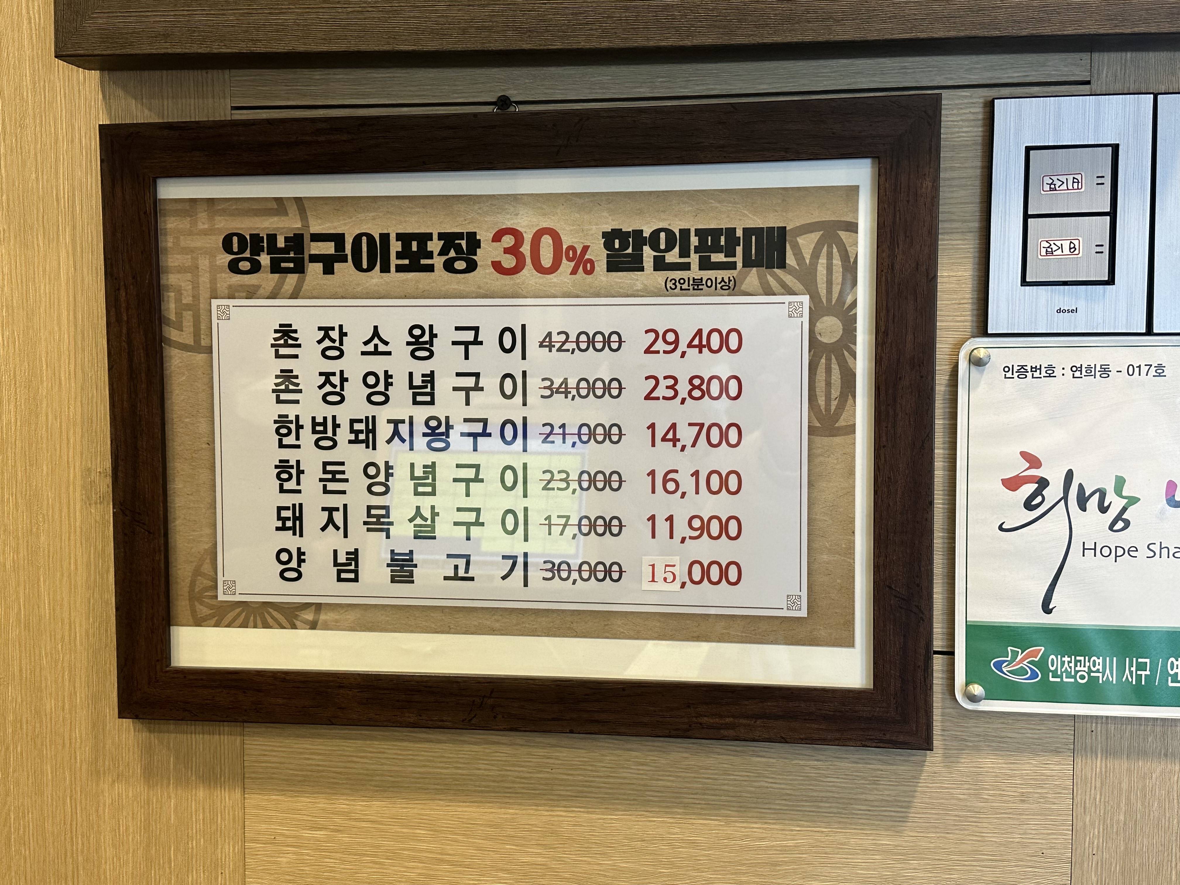 촌장골의 독특한 점은 양념구이 포장 시 앉아서 먹는 금액의 30%를 할인해 줍니다!