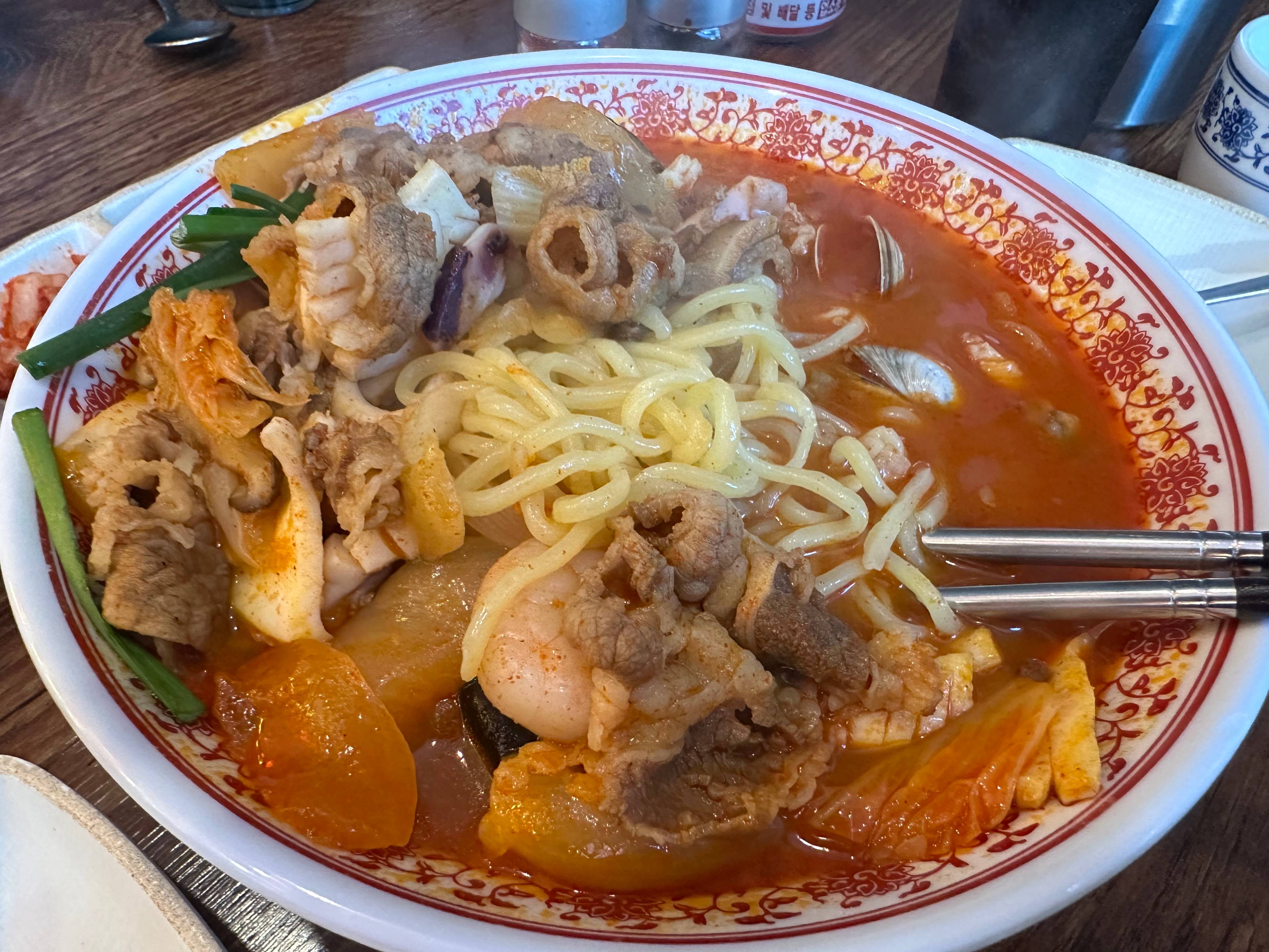 토핑이 보시는 것처럼 많이 들어가 있어서 우삼겹, 새우, 조개, 오징어 등을 먹다 보면 면을 다 먹기 힘들 수도 있습니다!