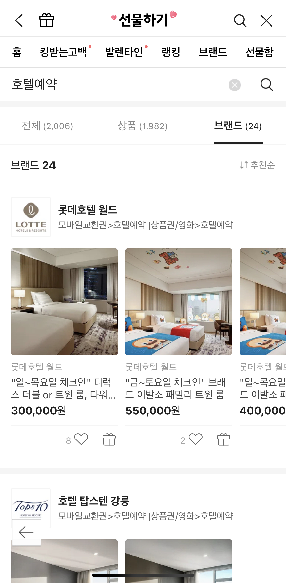 -> 원하는 브랜드 호텔 브랜드 선택 -> 선물하기