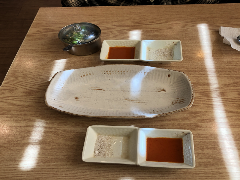 아래 사진은 기본 세팅입니다. 닭국수이다 보니 김치의 맛이 중요한데 보시는 것과 같이 김치가 너무 맛있었습니다. 그릇에 잘라먹을 수 있게 가위와 집게를 제공합니다!