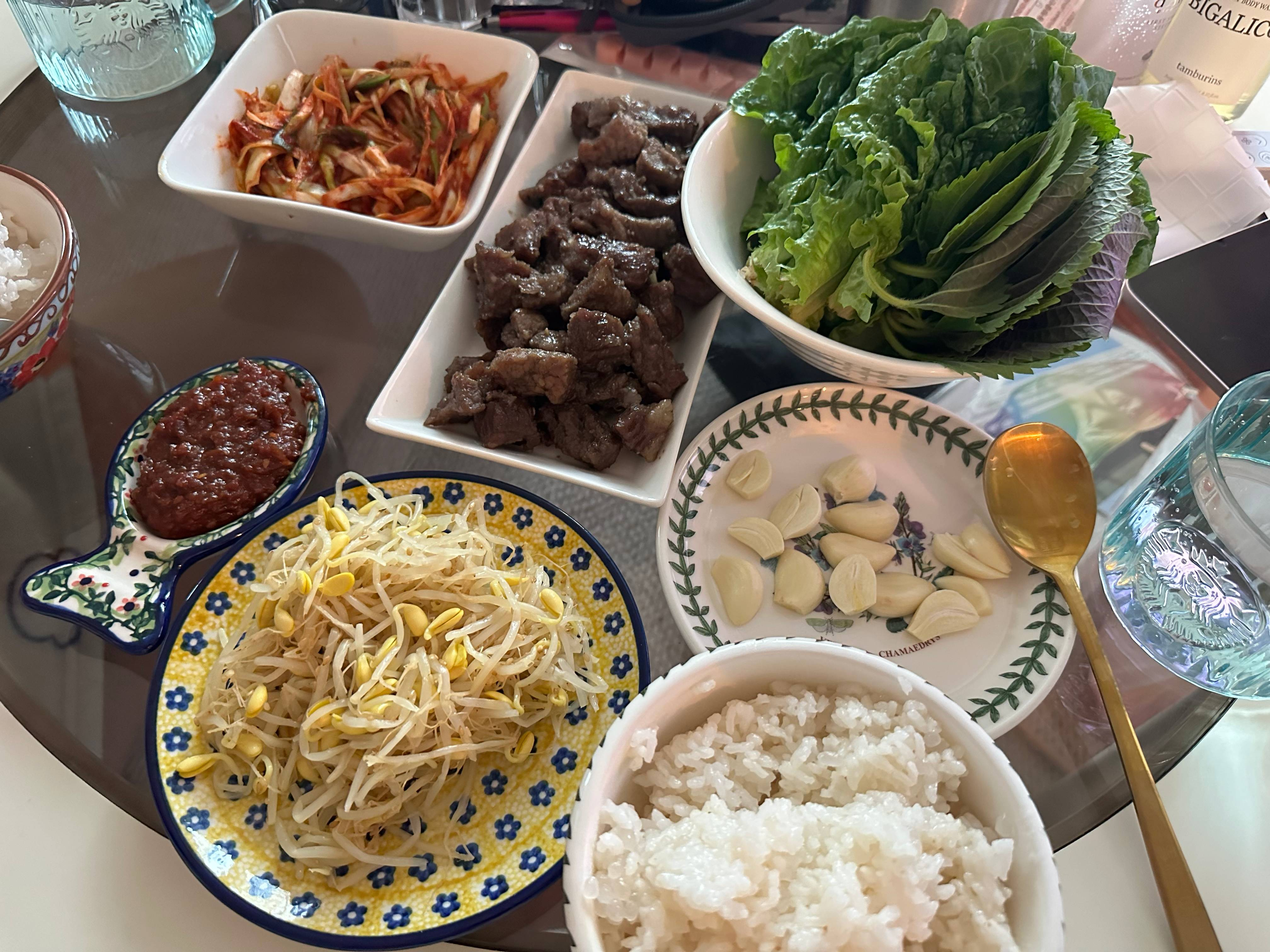 갈비 2팩을 구운 양입니다! 고기와 같이 먹기 위해 파채, 콩나물, 쌈, 쌈장, 마늘, 밥을 준비했어요!!